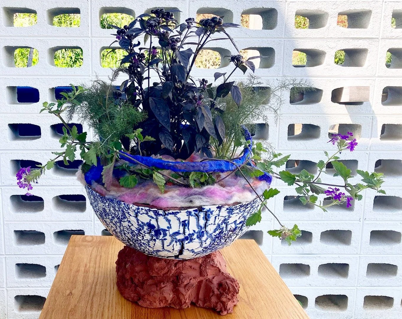 This project involved bringing together three artists’ works (vessel + trellis + mulch) and a selection of plants for each container garden. The two pieces were created during an artist residency at Parts and Labor in San Antonio, Texas in the summer, 2025 and were exhibited at Tracey Morgan Gallery in the fall, 2025. Art has long looked to nature as muse or supplier of materials, but with this project art and nature interact in a slightly different way as artworks act as supportive infrastructure to nurture growing plants.